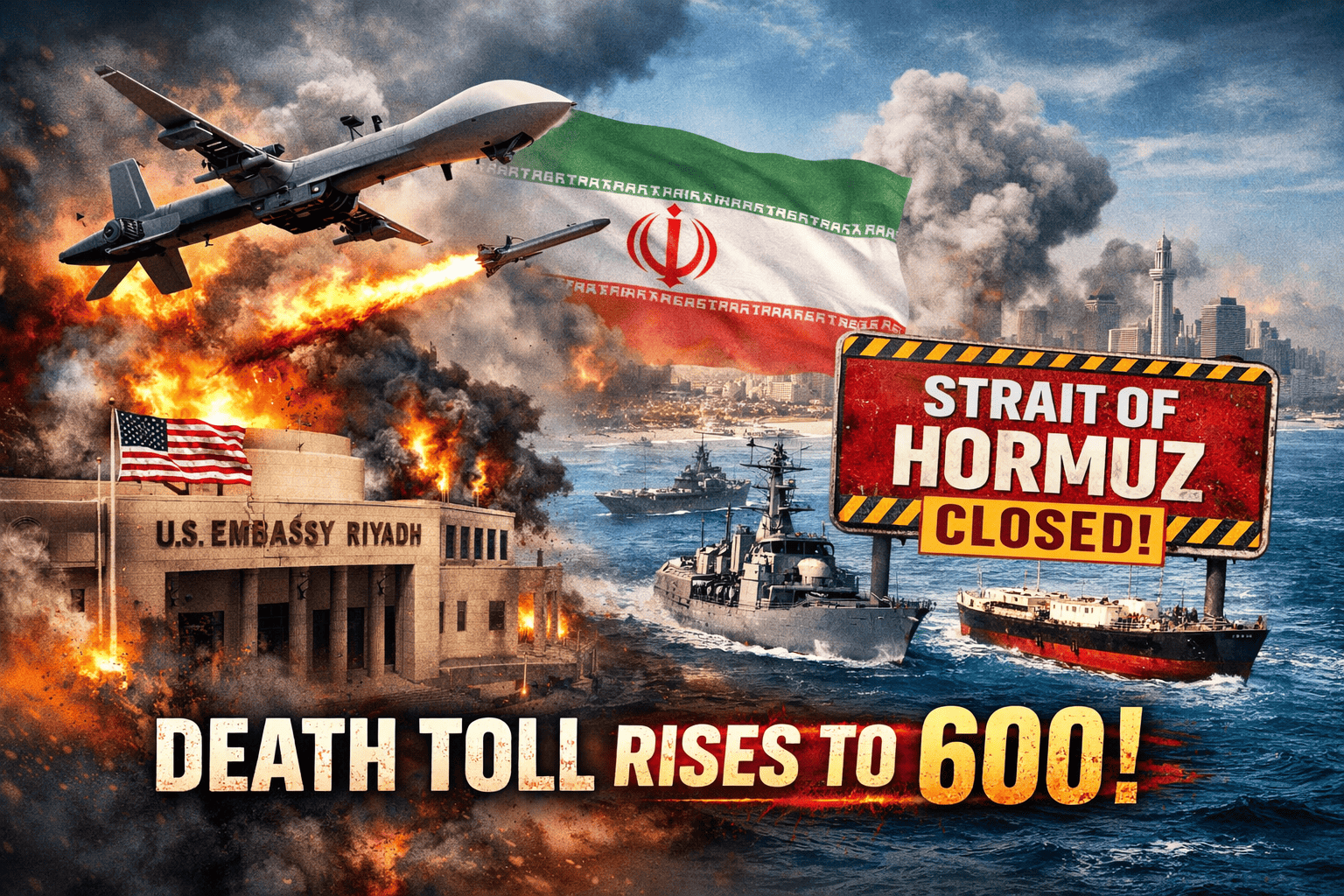 Tehran/Riyadh/Tel Aviv – The Middle East crisis has entered a catastrophic new phase as US embassy Riyadh drone attack Iran Strait Hormuz closed death toll 600 dominates headlines worldwide. In a series of dramatic escalations, Iranian forces have struck the American diplomatic compound in the Saudi capital, blocked the world’s most critical oil shipping lane, and continued devastating bombardments of Tehran and Beirut as civilian casualties mount past 600.